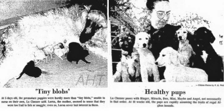 In July 1973 Mrs Chesser's (Hi-Lu kennel USA) Afghan bitch whelped 5 puppies 13 days prematurely, Pups weighed only 5-6 ounces each. Three Vets said little chance they would survive, but the Chesser's took care of the pups around the clock and they all survived.
