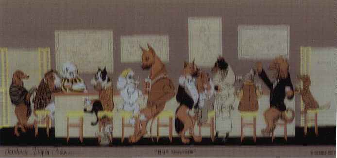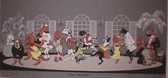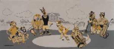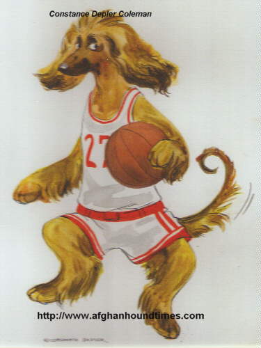 Above is a jpg of an original Watercolour by Constance Depler Coleman. This was painted around 1950 At that time Ms Coleman's (nee Depler) work was sold by Abercrombie & Fitch in Chicago. I am fortunate to own the original Watercolour and have enjoyed a dialogue wth Ms Depler in which we discussed the inspiration and background to her watercolour. Ms Depler has also provided me with a print of an unpublished (hence not published here either) work she did around the same time, involving a scene of a meeting underway where the "Afghan Hound" caricature at this meeting represents one of her family members