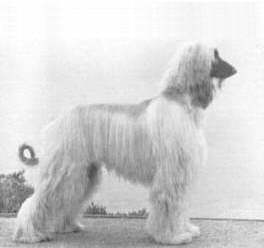 One of America's most famous breeders, Lois Boardman (Akaba) wrote in Afghan International ..."What is Afghan type? To me, the very things asked for in our breed standard - the components that set our breed apart from all others - namely "the look of eagles", the long silky topknot, the sloping croup and low tail set, the prominent hip bones, the ringed "monkey" tail, the short slick saddle hair with silky body hair AND the peculiar coat pattern showing 'cuffs' on the front and back legs. These are the things that make an Afghan Hound a true member of his ancient proud race! Just take these items away, one by one, from your mental picture of an Afghan, and slowly you will be seeing just another dog".On the age old argument of type versus soundness, she says..."Well, to win in the ring we must strike the happy medium of both, as type without soundness will rarely win. Afghans, and all dogs for that matter, must be as functionally sound as possible. but NEVER should breed type be sacrificed for just sound, furry beasts, galloping around the ring that is scheduled for Afghan Hounds. . . "