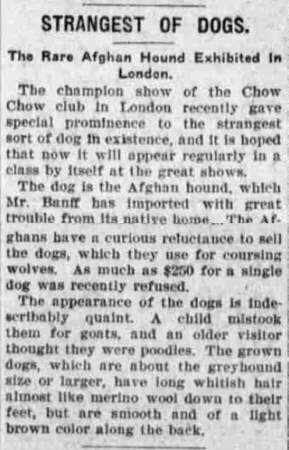 First sight of an Afghan hound for Canadians and Americans may well have been a wire-photo which was syndicated across the states in 1908.The photo may also have been syndicated in Canada