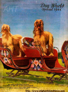 Marions Afghan hounds were featured on the cover of fhe Saturday Evening Post, in 1944 and also feartured on the cover of Life Magazine in 1945. Her Afghan hounds also appeared in various canine publications. Shown below is the cover of Dog World 1944 with Rudiki on the right and Rana Of Chaman on the left. We have also below the cover for Coronet Magazine dated August 1944, featuring Rudiki and Rana. So all this publicity in the media about the Five Mile Afghan hounds, and Marions aviator exploits ensured she remained in the public eye in this era.